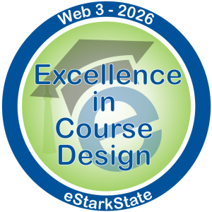 Excellence In Course Design – This badge is awarded to courses that complete a rigorous internal course design process and meet national Quality Matters standards of best practices in online learning. This is a required step prior to sending a course to QM for a formal review. The Excellence in Course Design award recognizes the faculty’s effort to create a high-quality, engaging online course that aligns course content with course objectives.